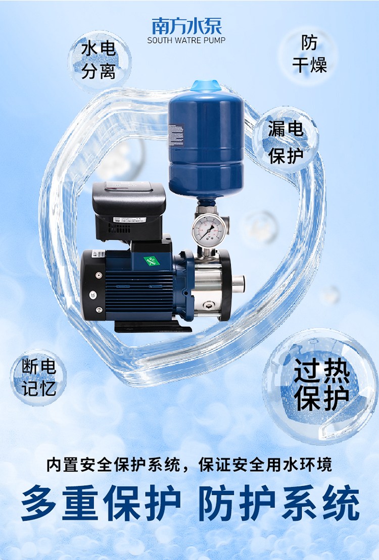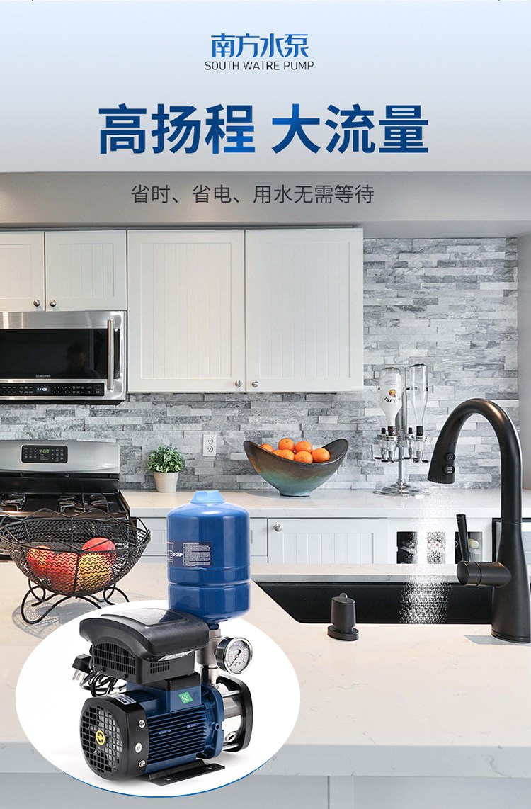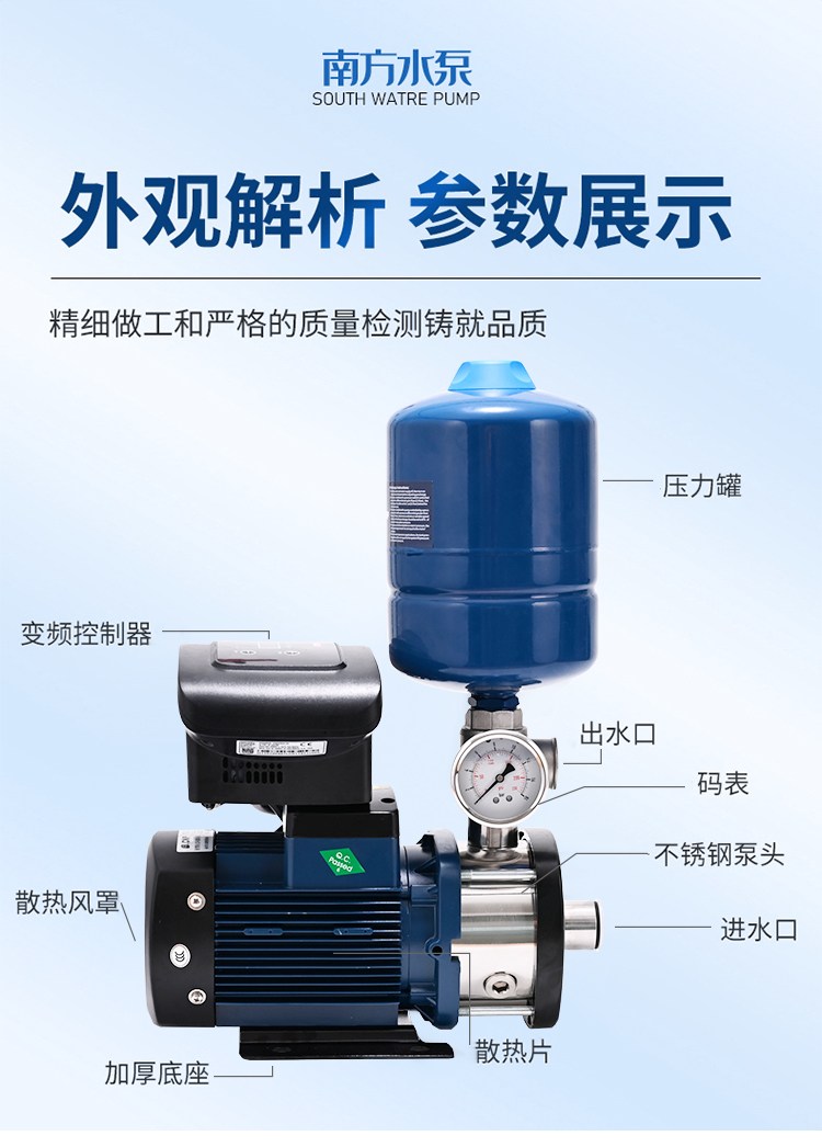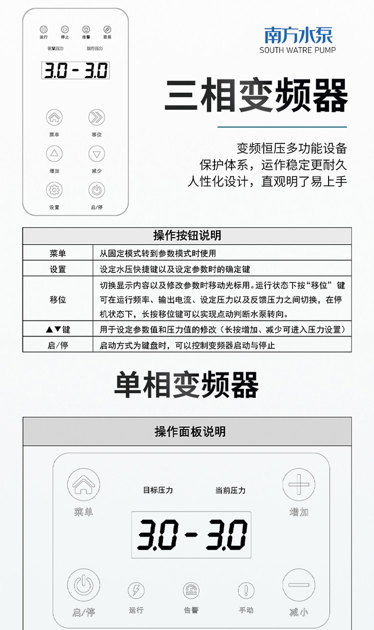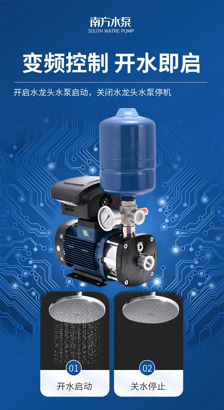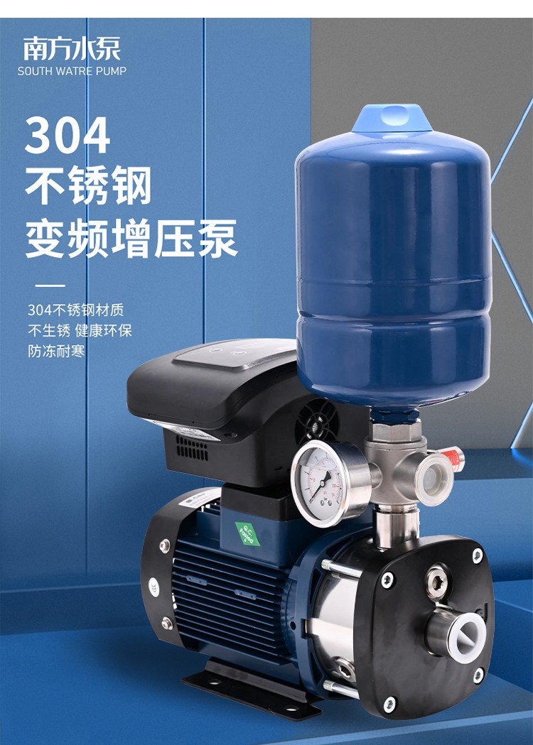 南方CHME系列臥式智能恒壓變頻泵采用了變頻調(diào)速及自動(dòng)化控制相結(jié)合的技術(shù),配合高效節(jié)能的CHM非自吸輕型臥式多級(jí)離心泵。整機(jī)主要由CHM泵、控制器、傳感器、壓力罐、五通止回閥及軸向抗震壓力表等組成。具有性能穩(wěn)定、高效節(jié)能、全自動(dòng)智能控制、低噪音、耐腐蝕、結(jié)構(gòu)緊湊、外形美觀、體積小、重量輕等特點(diǎn)。
