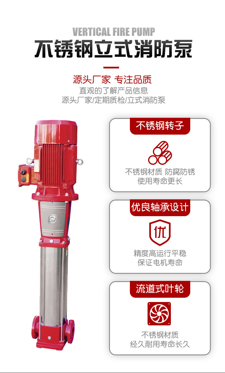 南方XBD-DL非自吸立式多級消防泵組,電機軸通過聯軸器直接與泵軸聯接,葉輪導葉采用鑄鐵件,泵進出水口位于泵底同一直線上。